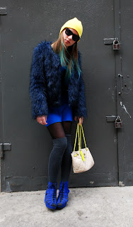 Stylówka jest punkowa i kolejny raz z przymróżeniem oka. Bazą stał się oczywiście kolor niebieski, do którego dobrałam kobaltowe koturny, paznokcie i bandażową sukienkę. Zabawny efekt udało mi się uzyskać łącząc wszystko z ciemnoszarym sweterkiem z kolorowe pantofelki. Jest to ostatnio (od soboty:D) jeden z ulubionych elementów mojej szafy;) Zachowując proporcjonalność w kolorach przydały się grube, grafitowe zakolanówki. Dodałam jeden z moich ukochanych naszyjników- Cupcake, kolorowe bransoletki (które będą towarzyszyły mi pewnie całe lato <3) i złoty full- finger ring. Na koniec doszedł akcent w moim ulubionym jasnożółtym kolorze- torebka (dziękuję!) z zestawieniem kolorystycznym sezonu i czapkę skarpetę. Na dziś to tyle, zostawiam Wam dużo zdjęć do obejrzenia (i komentowania:)). Set jest ostry i słodki za razem.
